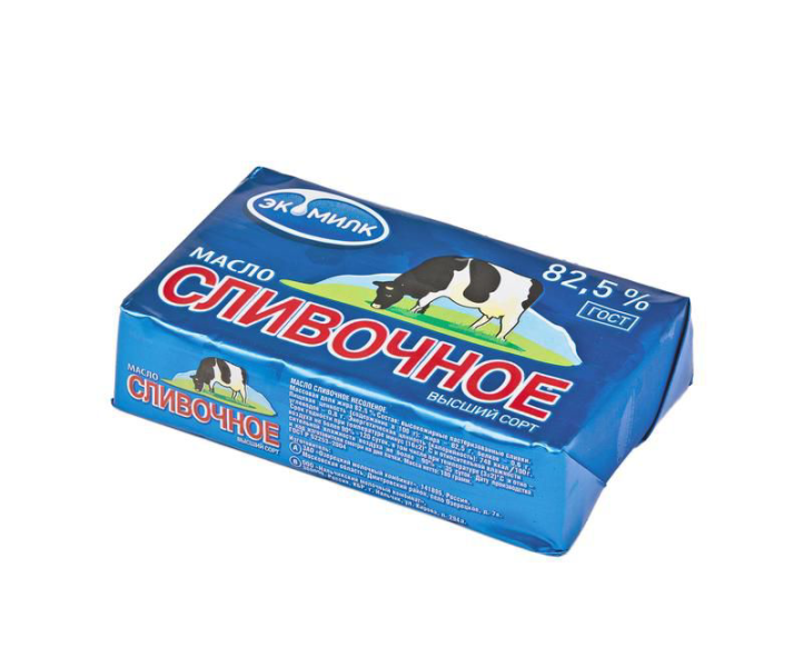 Сливочное масло ЭКОМИЛК высший сорт 82,5% изготовлено из пастеризованных высокожирных сливок, которые придают ему настоящий молочный вкус. Сливочное масло может служить как самостоятельным продуктом, так и применяться при приготовлении соусов, каш, мясных и овощных блюд. Уникальный набор аминокислот и витаминов, содержащихся в сливочном масле ЭКОМИЛК, делает этот продукт незаменимым в детском питании. Массовая доля жира 82,5 % Состав: высокожирные пастеризованные сливки Пищевая ценность (содержание в 100 г): жира – 82,5г, белков – 0,6г, углеводов - 0,8 г. Энергетическая ценность 748ккал Срок годности: - 120 суток при Т не выше минус 16'C; - 35 суток при Т от +1'C до + 3'C. ГОСТ Р 52969-2008. Производитель: ЗАО Озерецкий молочный комбинат, Москва. Россия