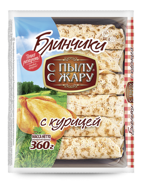 Блинчики фаршированные быстрозамороженные с курицей. Состав: тесто (вода питьевая, мука пшеничная, хлебопекарная, в/с, натуральная молочная сыворотка, сахар-песок, масло подсолнечное рафинированное дезодорированное вымороженное, яичный меланж, соль поваренная пищевая, разрыхлитель: гидрокарбонат натрия, регулятор кислотности: кислота лимонная пищевая), начинка (фарш куриный мехобвалки, филе кур, вода питьевая, соевый белок, лук репчатый свежий, кожа куриная, мука пшеничная хлебопекарная в/с, пищевые волокна, соль поваренная пищевая, комплексная пищевая добавка Гелеон 179М, (животный белок, растительный белок, стабилизатор Е412, мальтодекстрин), перец черный молотый). Противопоказания: не рекомендуется при индивидуальной непереносимости сои. Пищевая ценность на 100г продукта: белки 7,5г, жиры 5г, углеводы 30г. Энергетическая ценность на 100г продукта: 200 ккал/840 кДж. Хранить при температуре минус 18'C. Срок годности: 6 месяцев. Продукт не подлежит вторичному замораживанию