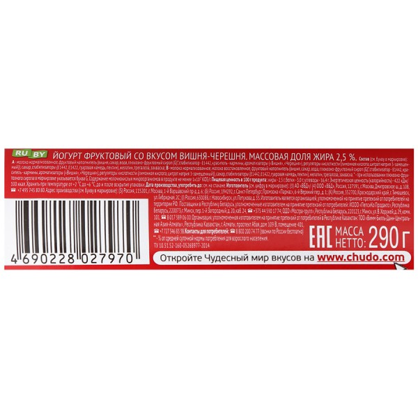 БЗМЖ Йогурт Чудо 2,5% вишня-черешня 290г стакан БЗМЖ Йогурт Чудо 2,5% вишня-черешня 290г стакан