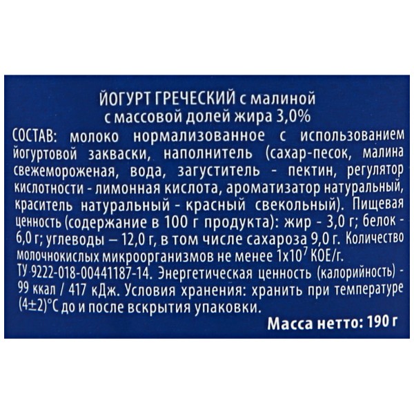 Состав: Молоко нормализованное с использованием йогуртовой закваски, наполнитель (сахар-песок, малина свежезамороженная, вода, загуститель – пектин, регулятор кислотности – лимонная кислота, ароматизатор натуральный, краситель натуральный Красный свекольный). Пищевая ценность в 100г продукта: жиры – 3,0г, белки – 6,0г, углеводы -12,0г (в т.ч. сахароза 9,0г). Срок годности 29 суток. Хранить в холодильнике при температуре 4±2'C