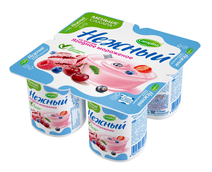 Йогуртовый продукт НЕЖНЫЙ 1,2% со вкусом Ягодное мороженое, 100 г – вкусное и полезное лакомство, созданное на основе натурального молока, отборных сливок и концентрированного сока ягод. Оригинальный вкус мороженого понравится и взрослым, и детям, а низкое содержание жира делает продукт подходящим для диетического питания. Йогурт изготовлен из высококачественных ингредиентов с использованием специальной закваски. Кисломолочные бактерии приводят в норму микрофлору кишечника, а высокое содержание кальция благотворно влияет на укрепление костей. Купить йогуртовый продукт НЕЖНЫЙ 1,2% со вкусом Ягодное мороженое, 100 г вы можете в Москве в торговом центре METRO.Производитель: ООО Кампина, Россия.Состав: обезжиренное молоко, сливки, вода, сахар, глюкозно-фруктозный сироп, загуститель – модифицированный крахмал, сухая молочная сыворотка, наполнитель (вода, концентрированные соки из черной смородины и вишни, краситель – кармин, ароматизаторы Ваниль-Крем и Лесные ягоды идентичные натуральным, загуститель – модифицированный крахмал, концентрированный сок клубники, регулятор кислотности – цитрат натрия, концентрированные соки черники и малины), пищевой желатин, лактоза, с использованием закваски. Изготовлено с использованием сухой молочной сыворотки.Пищевая ценность: белки – 2,5 г, жиры – 1,2 г, углеводы – 18 г.Энергетическая ценность: 95 ккал.Срок годности: 4 месяца.Условия хранения: от 2°C до 25°C.