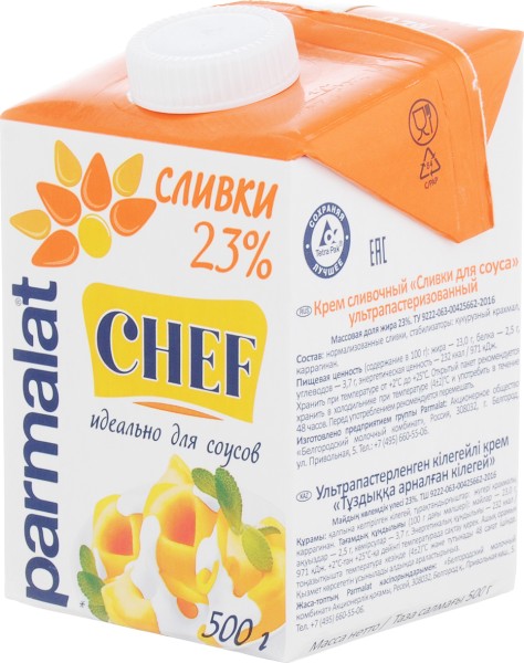 Производитель: Parmalat; Код производителя: 510016; Страна-производитель: Россия; Объём: 0, 5л; Срок годности: 6 мес.; Штрихкод: 4601662000344; Вес: 0.525; Тип товара: Сливки; Размер упаковки (Длина х Ширина х Высота): , см; Название: Parmalat сливки ультрастерилизованные 23%, 0, 5 л; Объем, л: 0, 5; Состав: Нормализованные сливки, стабилизаторы- кукурузный крахмал, каррагинан.; Срок годности в днях: 180; Энергетическая ценность, ккал/100 г: 232; Событие для подарка: Новогодний стол; Сырье: Коровье; Жирность, %: 23; Не содержит: Заменитель молочного жира; Срок годности, дн.: 121-180 дней; Срок годности, дн. (служебный): 182; Минимальная температура: +2; Максимальная температура: +25 Идеальны для приготовления соусов к пасте и ризотто! Сливки помогут в домашних условиях создать истинные шедевры: ароматный ризотто, аппетитную пасту, соблазнительный крем-суп и многие другие блюда.