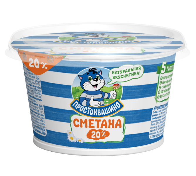 Сметана Простоквашино 20%, 180г. Состав: сливки нормализованные, заквасочные микроорганизмы. Пищевая ценность на 100г: жир 20г, белки 2,5г, углеводы 3,4г. Энергетическая ценность: 204ккал/840кДж. Хранить при Т от +2' до +6'С до и после вскрытия упаковки. Срок хранения 30 суток. ТУ 10.51.52-069-13605199