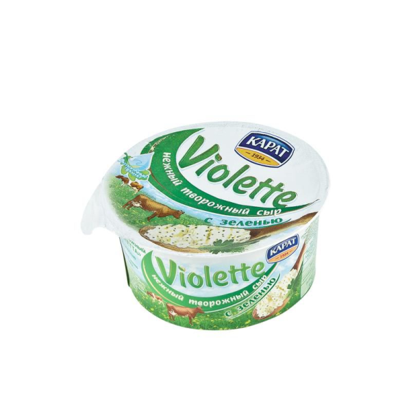 ОАО «Карат» - это одна из крупнейших российских компаний, занимающаяся выпуском различных видов сыров, а также сливочного масла, творога и сметаны. Плавленые сыры этой фирмы известны во всей России: наверное, каждый пробовал знаменитые «Дружбу», «Янтарь», «Волна» и «Шоколадный». Но «Карат» не перестает нас радовать и удивлять: совсем недавно она запустила в производство новую линейку творожных сыров – VIOLETTE.Сыр творожный VIOLETTE с зеленью производится из отборного коровьего молока. Продукт отличается нежным, слегка соленым, вкусом творожного сыра с нотками ароматной зелени.Вы можете использовать творожный сыр в приготовлении бутербродов, закусок, соусов и начинки для различной выпечки или блюд из мяса. Все будет зависть целиком от вас и вашей фантазии.Приобретайте сыр творожный VIOLETTE с зеленью, 140г в METRO Cash&Carry в Москве по самой демократичной цене.Состав: молоко коровье пастеризованное нормализованное, соль поваренная пищевая, стабилизатор (камедь плодов рожкового дерева, гуаровая камедь, желатин), укроп сушеный, лук сушеный, петрушка сушеная, ароматизатор идентичный натуральному "Укроп", с использованием заквасочных микроорганизмов - смеси лактококков и термофильных молочнокислых стрептококков, молокосвертывающего фермента животного происхождения.Пищевая ценность на 100г продукта: белки - 9,0; жиры - 27,4; углеводы - 3,3.Энергетическая ценность на 100г продукта: 295,4 ккал.Условия хранения: хранить при температуре от +0'C до +8'C.Срок годности: 120 суток.Производитель: ОАО "КАРАТ"
