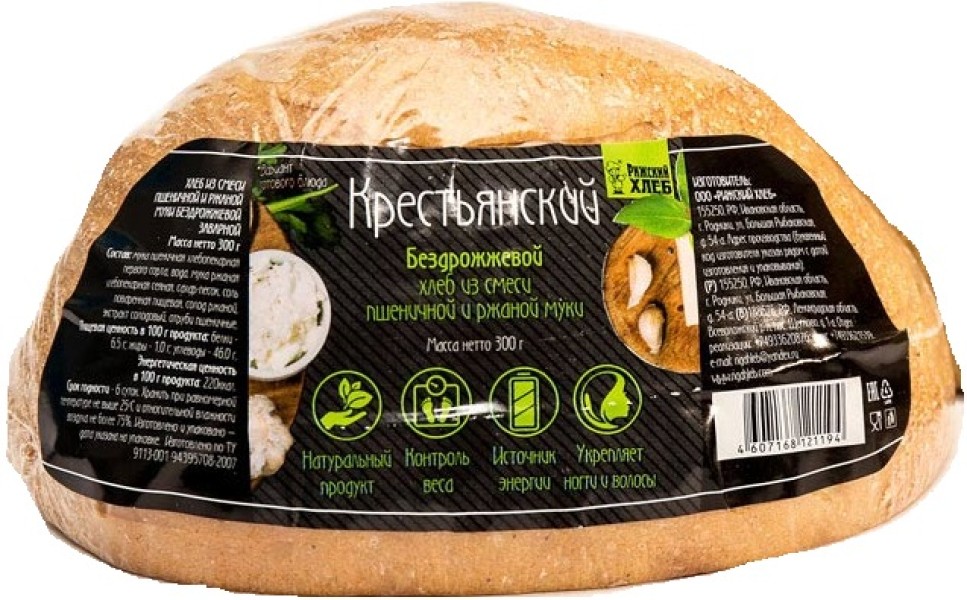 Хлеб РИЖСКИЙ ХЛЕБ Крестьянский бездрожжевой заварной подовый, 300 г выпечен из смешанной муки высокого качества по старинному русскому рецепту. Он имеет богатый витаминно-минеральный состав. При приготовлении теста не используются дрожжи, которые способны нарушить микрофлору кишечника. Воздушный хлеб имеет приятный аромат, легкий вкус. Он идеально подходит к первым блюдам, хорошо сочетается со сливочным маслом и может использоваться для приготовления бутербродов. Купить хлеб РИЖСКИЙ ХЛЕБ Крестьянский бездрожжевой заварной подовый, 300 г можно в Москве в торговом центре METRO. Производитель: ООО Рижский хлеб, Россия, Ивановская обл., г.Родники, ул. Б. Рыбаковская, д. 54а.Состав: мука ржаная хлебопекарная сеяная, вода, мука пшеничная хлебопекарная первого сорта, сахар-песок, соль поваренная пищевая, солод ржаной, экстракт солодовый.Пищевая ценность: белки – 6,7 г, жиры – 0,9 г, углеводы – 46,5 г.Энергетическая ценность: 220,9 ккал.Срок годности: 6 суток.Условия хранения: хранить при температуре не выше 25°C и относительной влажности воздуха не более 75%.