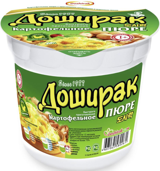 Пюре картофельное ДОШИРАК с курицей производится исключительно на современном оборудовании, благодаря чему натуральные картофельные хлопья, использующиеся в качестве сырья, сохраняют свои полезные первоначальные свойства. Продукт удобен тем, что поможет вам утолить чувство голода и восстановить запас сил в любое время и в любом месте: этому способствует удобная форма выпуска (пластиковый стаканчик на 1 порцию). Смесь не нужно варить, достаточно залить кипятком, перемешать и немного подождать. В готовом блюде уже содержатся все необходимые приправы и специи, но вы можете добавить, например, сухарики или соусы. Хранить пюре рекомендуется в темном, сухом месте. Купить пюре картофельное ДОШИРАК с курицей вы можете в Москве в торговом центре METRO.Производитель: «Доширак КОЯ», Россия.Состав: картофельные хлопья, продукт комплексный жировой (жир растительный, лактоза, молочный протеин), соль йодированная, гренки (мука пшеничная ,масло растительное,соль, дрожжи), лук жареный (лук, масло растительное, мука пшеничная,соль), усилитель вкуса (глутамат натрия), сахар, белый перец, куркума, ароматизатор идентичный натуральному «вареная курица», петрушка, лук зеленый сушеный.Пищевая ценность: белки — 5,1 г, жиры — 5,3 г, углеводы — 71,2 г.Энергетическая ценность: 350 ккал.Срок годности: 12 месяцев.