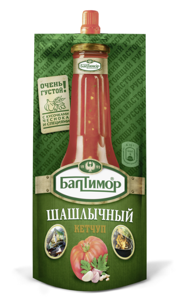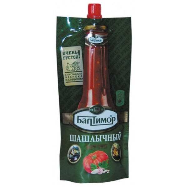 Кетчуп БАЛТИМОР Шашлычный густой дой-пак, 260 г – полностью готовый к употреблению продукт, созданный на основе томатной пасты. Добавление сладкого перца, чили, а также чеснока делает вкус соуса более интересным, придает ему пикантность. Соус продается в удобной для хранения и перевозки упаковке. Это мягкий дой-пак объемом 260 г, дополненный закручивающимся колпачком. Такая упаковка обеспечивает экономичное дозирование. Мягкий пакет не займет много места на полке в холодильнике, его удобно брать с собой в поездку на дачу или на пикник. Соус хорошо дополнит вкус шашлыка и других мясных блюд. Приобрести кетчуп БАЛТИМОР Шашлычный густой дой-пак, 260 г можно в Москве в торговом центре METRO.Бренд: БАЛТИМОР.Страна-производитель: Россия.Состав: вода, томатная паста, сироп глюкозно-фруктозный, уксус столовый, волокна томатные, загуститель E1442, соль, чеснок, перец сладкий, перец чили, подслатитель сахарин (натриевая соль). Массовая доля растворимых сухих веществ не менее 18%.Энергетическая ценность на 100 г продукта: 60 ккал.Условия хранения: при температуре от +0°С до +25°С.Срок годности: 9 месяцев.