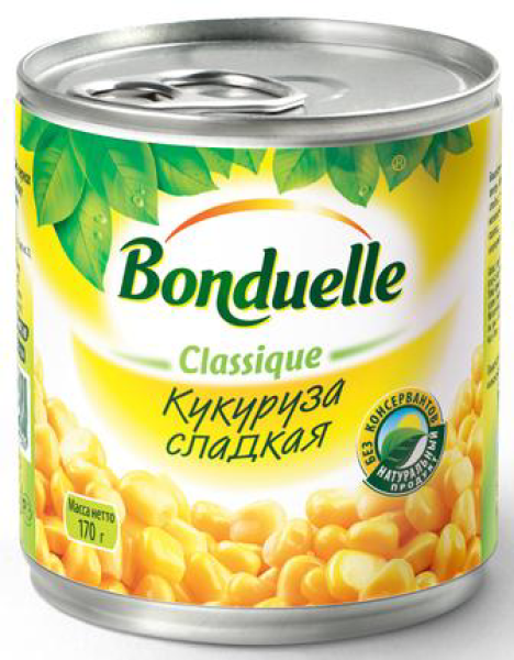 Кукуруза сладкая в зернах,170г. Состав: сладкая кукуруза в зернах, соль поваренная пищевая, сахар, вода питьевая. Не содержит ГМО. Хранить при температуре от +0'C до +25'C и относительной влажности воздуха не более 75%. После вскрытия хранить при температуре +4'С(+/-2'С) не более 24 часов не рекомендуется хранить в открытой жестетаре. Срок хранения 4 года.