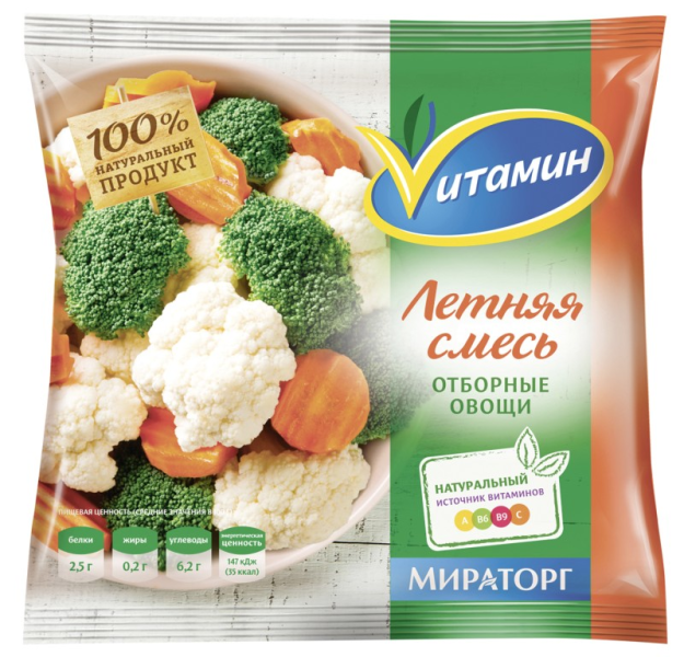 Овощная смесь VИТАМИН Летняя, 400г содержит столько витаминов, что их хватит, чтобы зарядить вас энергией и отличным настроением на целый день. Почувствуйте вкус лета в любое время года!Продукт не содержит ничего лишнего, только натуральные замороженные овощи! Используйте смесь для приготовления диетических или вегетарианских блюд. Огромное количество способов приготовления сделает ваш рацион не только очень полезным, но и разнообразным. Особые технологии заморозки позволяют продукту оставаться свежим долгое время.В торговом центре METRO в Москве вы всегда сможете купить овощную смесь VИТАМИН Летняя, 400г по выгодной цене.Состав: брокколи, цветная капуста, морковь.Энергетическая ценность: 114Ккал.Пищевая ценность: жиры - 0,9, белки - 5,4г, углеводы - 22,0г,витамин С - 17,3мг, бета-каротин - 0,2мг.Хранить при температуре: -18°С.Масса нетто: 400г.