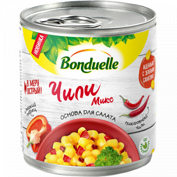 Овощная смесь БОНДЮЭЛЬ с чили имеет насыщенный пикантный вкус. В состав продукта входит кукуруза со сладким и острым перцем. Он может использоваться как гарнир или как один из компонентов салата. Например, можно обжарить морепродукты на оливковом масле, добавить к ним смесь и разрезанные пополам помидоры черри. Такой салат станет «изюминкой» на любом столе.Смесь Bonduelle с чили поставляется в жестяной банке. За счет герметичности продукт может храниться долгое время и не терять вкусовых качеств. Продукт подходит для диетического питания: в 100 граммах содержится всего 76 ккал. Купить овощную смесь БОНДЮЭЛЬ с чили, 310 г вы можете в Москве в торговом центре METRO.Упаковка: жестяная банка.Состав: кукуруза в зернах, красный сладкий перец в кубиках, вода питьевая, соль, картофельный крахмал, острый перец Чили 0,18%, загустители: ксантановая камедь и гуаровая камедь, антиокислитель: аскорбиновая кислота.Пищевая ценность на 100 г продукта: белки – 2,2 г; углеводы – 13,1 г, жиры – 1 г.Энергетическая ценность: 321 кДж/76 ккал.Вес продукта: 0,31 кг.
