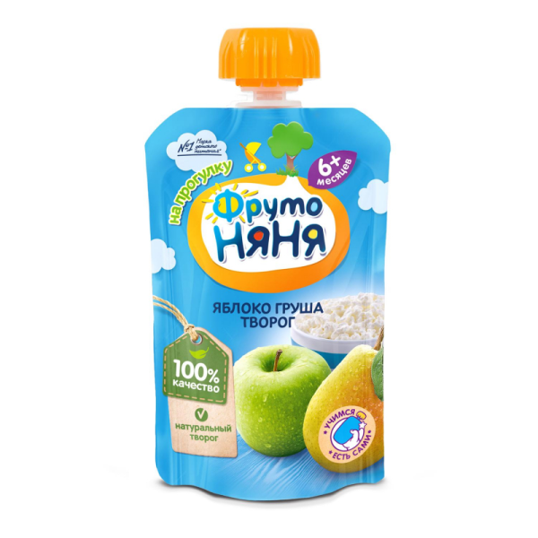 Пюре Яблоко/груша/творог ФРУТОНЯНЯ, 90 г — это превосходный вариант для первого прикорма, который подойдет для детей от шести месяцев. В состав продукта входит пюре из яблок и груш: эти фрукты содержат большое количество витамина С (для иммунитета) и других витаминов, важных для растущего иммунитета, а также клетчатку для хорошего пищеварения. Чтобы сделать продукт более сытным, помимо пюре присутствует творог, источник белка и кальция. Пюре не содержит сахара и крахмала, а также искусственных подсластителей и красителей. У продукта нежный аромат и сбалансированный, кисло-сладкий вкус. Упаковка с носиком, так что кормить малыша удобно, вдобавок она компактная, занимает мало места в холодильнике и в сумке. Приобрести пюре Яблоко/груша/творог ФРУТОНЯНЯ, 90 г можно в Москве в торговом центре METRO.Бренд: ФрутоНяня.Страна: Россия.Тип: пюре.Вкус: яблоко-груша.Состав: пюре из яблок, пюре из груш, творог, сахар, загуститель – пектин.Изготовлено из концентрированных пюре.Рекомендации по употреблению: детям с 6 месяцев, начиная с 1/2 чайнойложки 2 раза в день, постепенно увеличивая к 12 месяцам до 100 г в день.Пищевая ценность: белки — 1 г, жиры — 0 г, углеводы — 17,3 г.Калорийность: 73,2 ккал.Минеральные вещества Калий – 70-140мг.Вес: 90 г.Особенности: не содержит консервантов, не содержит красителей, не содержит ГМО.Срок хранения: 12 месяцев.Срок годности после открытия: 1 день.Вид упаковки: упаковка паучХранить при температуре от 0 до +25'С, с относительной влажностью воздуха не более 75%, беречь от солнечных лучей.Не подогревать в микроволновой печи.Гомогенизированное.Стерилизованное.Продукт готов к употреблению.