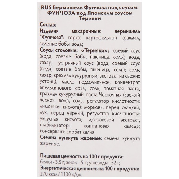 Производитель: Sen Soy; Код производителя: 00000041560; Страна-производитель: Россия; Тип упаковки: Картонная коробка; Срок годности: 12 мес.; Штрихкод: 4607041136529; Вес: 0.170; Тип товара: Лапша быстрого приготовления; Состав: Бобовая вермишель Фунчоза – 60 г Соус Терияки – 60 г Кунжут – 5 г; Энергетическая ценность: 270 ккал/100 г; Кухни мира: Паназиатская; Условия хранения: При температуре до 25`C