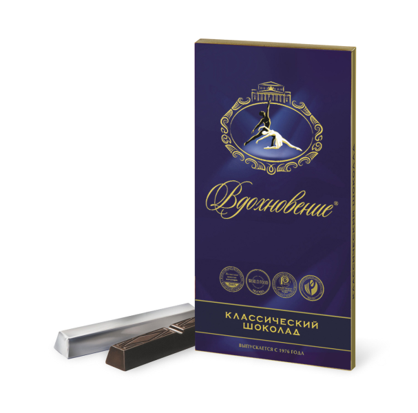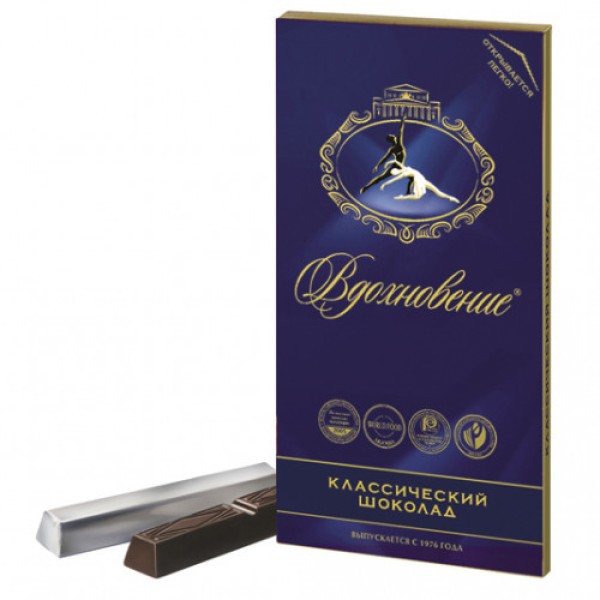 Вдохновение – классический темный шоколад. В его состав входит дробленый жареный фундук и коньяк. Продукт изготавливается по оригинальной рецептуре 1976 года. В каждой упаковке вы найдете 10 стиков или мини-плиток, которые порадуют вас своим чудесным вкусом, улучшат настроение и придадут жизненные силы.Шоколад Вдохновение классический, 100г является высококачественным продуктом, употребляя который вы будете чувствовать себя прекрасно не только физически, но и душевно. Производится продукт только из натуральных и экологически чистых ингредиентов. Без консервантов.Пищевая ценность на 100 г:Белки: 7,4 г.Жиры: 42,2 г.Углеводы: 43,4 г.Калорийность: 579 ккал.Состав продукта:cахар, какао тертое, ядро ореха фундука дробленое, масло какао, эмульгатор Е322, коньяк, антиокислитель Е300, ароматизатор идентичный натуральному Ваниль.