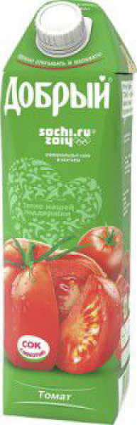 Сок ДОБРЫЙ Томат, 1л - полезный напиток, освежающий и укрепляющий. В нем содержатся фитонциды, которые минимизируют брожение в кишечнике, калий, который является профилактическим средством против сердечнососудистых заболеваний, а также органические кислоты, нормализующие обмен веществ.Томатный сок можно пить даже тем, кто худеет, благодаря низкой калорийности продукта. Использовать его можно даже тем, кто страдает заболеваниями суставов и почек, так как в нем меньше пуринов и щавелевой кислоты, чем в помидорах.Всего два стакана сока способны удовлетворить суточную потребность организма в витаминах A и ССок ДОБРЫЙ Томат, 1л в Москве всегда можно приобрести в торговом центре METRO по привлекательной цене.Вид напитка: Сок.Объем: 1л.Вкус: томатный.Бренд: Добрый.Страна-производитель: Россия.Производитель: ЗАО Мултон.Состав: томатное пюре (паста), сахар, вода, соль.Изготовлен из концентрированного томатного пюре(пасты).Для питания детей с 3 - х лет. Без консервантов и красителей.Энергетическая ценность: 22,4 ккал.Пищевая ценность на 100 мл: углеводов - не менее 5,6г.Хранить при t от 0'C до +25'C.Открытый пакет хранить в холодильнике не более суток.Срок годности: 1 год.Стандарт: ТУ 9162-008-56232828-2005.