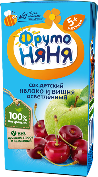 Тип: сок; Страна: Россия; Объем, л: 0,2; Возраст ребенка, месяцев: с 5; Состав: Сок из яблок, сок из вишни. Изготовлен из концентрированных соков. Без добавления сахара. Содержатся сахара природного происхождения.; Энергетическая ценность, ккал/100 гр: 46; Углеводы, гр: 11,5; Срок годности, мес: 12; Минимальная температура хранения, ℃: 0; Максимальная температура хранения, ℃: +25