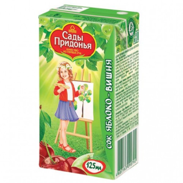 Сок САДЫ ПРИДОНЬЯ Яблоко, вишня, 125 мл поможет вашему ребенку утолить жажду и быстро восстановить силы во время энергичной прогулки. Продукт предназначен для питания детей с пяти месяцев. В нём содержатся витамины, магний и железо, которые в сочетании с фолиевой кислотой укрепляют стенки капилляров и сосудов, предотвращают развитие малокровия. Сок этой марки создаётся без искусственных красителей и ароматизаторов, в нём нет даже сахара. В основе – только соки – из зеленых яблок, выращенных в хозяйствах компании-производителя, и вишни. Продукт абсолютно гипоаллергенный. Удобная маленькая упаковка позволяет брать напиток с собой на прогулку, в поликлинику или гости. Приобрести сок САДЫ ПРИДОНЬЯ Яблоко, вишня, 125 мл можно в в Москве в торговом центре METRO.Состав: яблочный сок, вишневый сок.Пищевая ценность: углеводы – 11,5 г в 100 мл продукта.Минеральные вещества: калий 70 ? 300 мг.Энергетическая ценность: 46,0 ккал/100 мл (190 кДж).Срок годности и условия хранения: 12 месяцев при температуре от 0?С до 25?С и относительной влажности воздуха не более 75%. После вскрытия упаковки хранить в холодильнике не более суток при температуре от 2?С до 6?С.