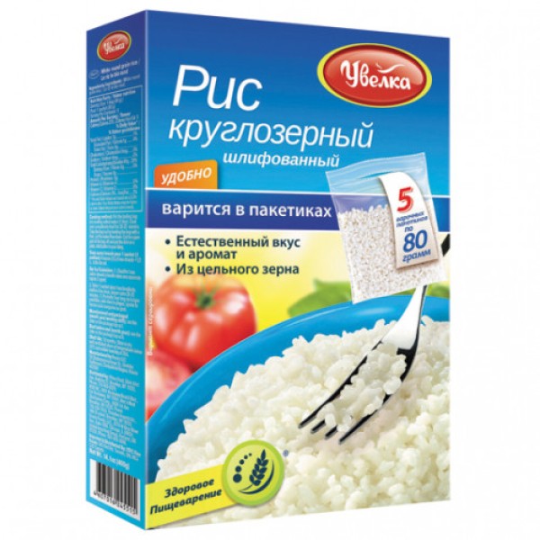 Рис УВЕЛКА круглозерный в пакетиках для варки — полезная основа для создания рассыпчатого гарнира, плова, запеканок, поскольку оптимально сочетается с мясом, рыбой, овощами. На приготовление питательного блюда затрачивается всего лишь 25 минут. Поскольку цельные вытянутые зерна расфасованы в специальные прозрачные пакеты, то продукт полностью сохраняет первоначальный внешний вид и не склеивается в процессе термической обработки. Большое количество витаминов группы В, содержащихся в составе риса, оказывает положительное влияние на стенки сосудов, очищая их и снижая уровень холестерина в крови. Калий, цинк и фосфор необходимы для улучшения самочувствия и укрепления костной ткани. Купить рис УВЕЛКА круглозерный в пакетиках для варки вы можете в Москве в торговом центре METRO. Производитель: ООО «Ресурс», Россия.Состав: рис круглозерный.Пищевая ценность в 100 г: белки — 8 г, жиры — 1 г, углеводы — 76 г.Энергетическая ценность: 340 ккал. Срок годности: 18 месяцев.
