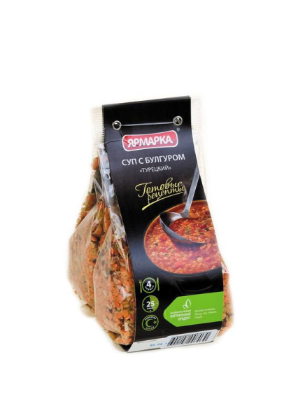 Суп Турецкий с булгуром ЯРМАРКА CAFE — натуральная смесь для приготовления одного из блюд национальной кухни Турции. Суп-пюре из красной чечевицы с булгуром в восточных странах олицетворяет семейное счастье и уют. Этот продукт позволит разнообразить меню в каждом доме. Вместе с тем больше не нужно беспокоиться о том, где найти редкие пряности и прочие ингредиенты, поскольку в нем уже собраны все натуральные компоненты в пропорциях, согласно традиционному рецепту. Одна упаковка смеси рассчитана на 4 порции. Понадобится всего лишь около получаса для того, чтобы насладиться аппетитным и ароматным супом.Каждый, кто ценит хорошую кухню, обязательно выберет продукцию торгового дома ЯРМАРКА. Купить суп Турецкий с булгуром ЯРМАРКА CAFE вы можете в Москве в торговом центре METRO.Производитель: Торговый дом «ЯРМАРКА», Россия.Состав: чечевица красная, булгур, специи, сушеные овощи.Пищевая ценность: белки — 19 г, жиры — 1,5 г, углеводы — 54 г.Энергетическая ценность: 310 ккал.Срок годности: 12 месяцев.