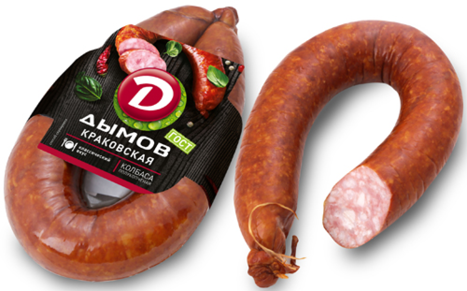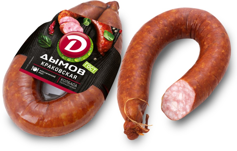 Колбаса Дымов Краковская полукопченая. Полукопченое колбасное изделие. Мясной продукт категории Б. Упаковано под вакуумом. Состав: свинина, говядина,соль поваренная пищевая, чеснок, сахар, перец черный, перец душистый, фиксатор окраски (нитрит натия). Пищевая ценность на 100г продукта: белок - 14г, жир - 45г. Энергетическая ценность 461 ккал. Хранить при температуре от 0'C до +6'C. Срок годности 30 суток. Срок годности после вскрытия упаковки при температуре от 0 до +6'С не более 3-х суток.