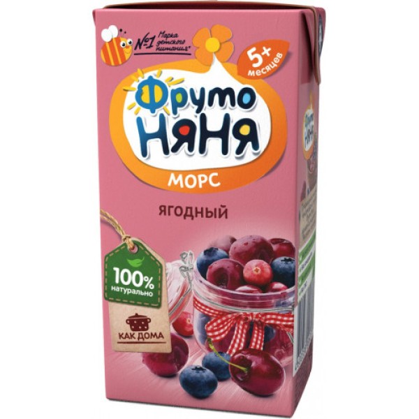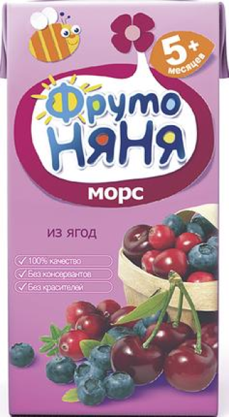 Тип: морс; Тип упаковки: тетра пак; Страна: Россия; Объем, л: 0,2; Возраст ребенка, месяцев: 5; Сок с мякотью: нет; Вкус: клюква. черешня. черника; Состав: сок из малины,пюре из малины, пюре из черной смородины, пюре из красной смородины, сахар, вода; Энергетическая ценность, ккал/100 гр: 45,6; Углеводы, гр: 11,4; Срок годности, мес: 12; Количество в упаковке, шт: 3; Вес, гр: 200; Минимальная температура хранения,: 0; Максимальная температура хранения,: 25 Морс ФРУТОНЯНЯ из клюквы, черешни и черники, 200мл – напиток, приготовленный из отборных спелых ягод без использования ароматизаторов и красителей. Лечебные свойства клюквы известны еще с незапамятных времен. Эта ягода использовалась для лечения больных гриппом, ангиной и другими инфекционными заболеваниями. Очень полезна и черника, ведь в ней содержится танин, обладающий противовоспалительным эффектом. А большое содержание в соке вишни фруктовых сахаров и витаминов А, С, РР, делают продукт особенно ценным для развивающегося организма.Напиток гипоаллергенен, упакован в стерильных условиях. Подходит для питания детей с 7 месяцев.В торговом центре METRO в Москве вы всегда сможете купить морс ФРУТОНЯНЯ из клюквы, черешни и черники, 200мл по выгодной цене.Производитель: ОАО «Прогресс», Россия.Состав: пюре из клюквы, пюре из черники, сок из вишни, сахар, регулятор кислотности - лимонная кислота, вода. Объемная доля сока и пюре - не менее 15%.Калорийность (на 100г): 45 Ккал.Углеводы: 11.4 г.Условия хранения: от 0°С до 25°С.Срок годности: 1 год.
