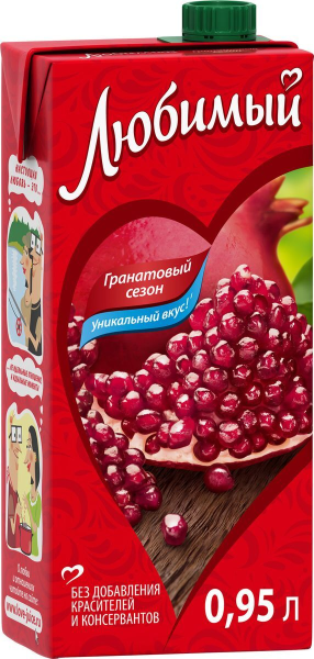 Сок «Гранатовый сезон» торговой марки «Любимый» относится к категории здорового питания, ведь его состав включает яблочный, гранатовый и концентрированный сок черноплодной рябины. Отличительной особенностью напитка стало отсутствие красителей, консервантов и синтетических добавок для усиления вкуса в составе. Сок объемом 0.95 л рекомендуется к употреблению даже детям от трех лет. Он стерилизован и асептически упакован в тетрапак, удобный для переноски и разлива. В охлажденном виде серия напитков «Гранатовый сезон» отлично утоляет жажду. Входящие в составе фруктовые соки обеспечивают множество полезных свойств. Они замедляют процесс старения, регулируют работу кишечника, повышают уровень гемоглобина, нормализуют работу ЖКТ. Такой напиток действует как мягкое мочегонное, однако не вымывает из организма калий. Бренд «Любимый» образовался в 1999 году. До сих пор он транслирует свои основные ценности: натуральность и экономичность. Приобрести сок «Любимый» «Гранатовый сезон» можно в Москве в торговом центре METRO. Бренд: лЮБИМЫЙ.Страна: Россия.Производитель: ОАО «ВБД Напитки».Упаковка: тетрапак (картонная коробка).Вкус: гранат. Углеводы, г: 11 Энергетическая ценность на 100 г: 44 кКал.Объем, л: 0.95.Состав: яблочный сок, гранатовый сок, сок черноплодной рябины, глюкозно-фруктозный сироп, регулятор кислотности – (лимонная кислота), вода.Условия хранения: хранить при температуре от 0 до 25°C. Открытую упаковку с продуктом хранить при температуре от 2 до 6°C не более суток. Срок годности: 12 месяцев.