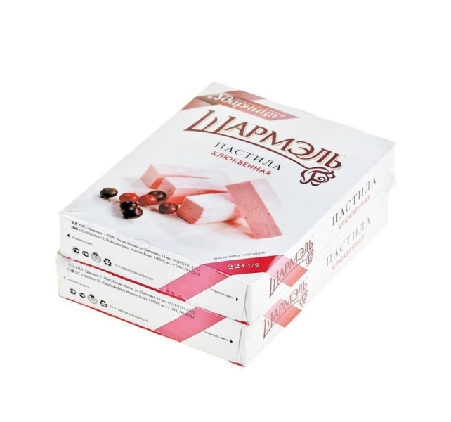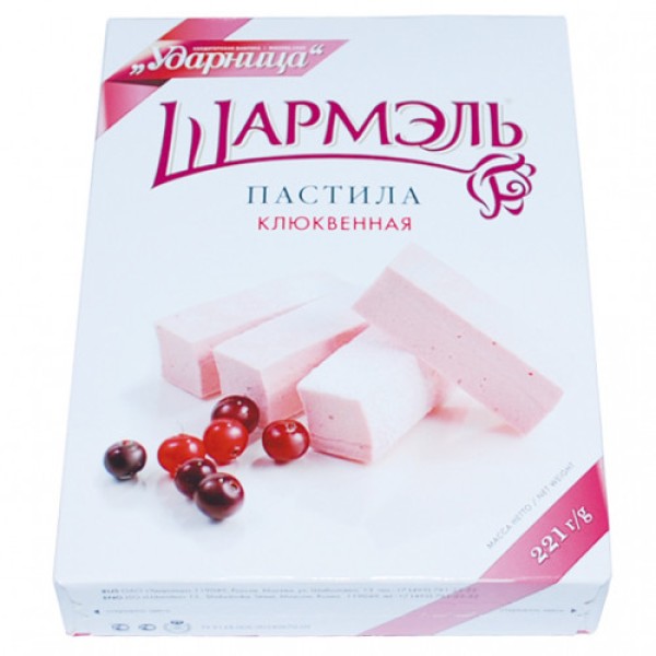 Пастила УДАРНИЦА Шармэль клюквенная, 221 г – оригинальный десерт, который никого не оставит равнодушным. Он приготовлен на основе яблочного и клюквенного пюре с применением натурального аналога желатина. Это не только вкусный, но и полезный продукт, богатый микроэлементами и витаминами. Он разрешен к употреблению взрослым и детям и будет хорошим дополнением к чаю и другим горячим напиткам. Упакована пастила в привлекательную картонную коробку, внутри которой находится ванночка из пищевого пластика. Найти пастилу УДАРНИЦА Шармэль клюквенную, 221 г вы всегда можете в Москве в торговом центре METRO.Производитель: ОАО "Ударница", Россия, г. Москва, ул. Шаболовка, 13.Состав: сахар-песок, пюре яблочное, пюре клюквенное, патока, пудра сахарная, желеобразователь – агар, белок яичный сухой, регуляторы кислотности – кислота молочная, цитрат натрия, порошок яблочный, ароматизатор натуральный, натуральный краситель – кармин.Пищевая ценность: белки – 0,5 г, углеводы – 79 г.Энергетическая ценность: 320 ккал.Срок годности: 60 суток.Условия хранения: хранить при температуре не более 25°C и относительной влажности воздуха не более 75%.