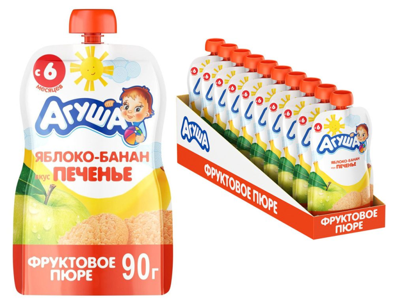 Пюре яблоко-банан-печенье АГУША, 90 г — это прошедший пастеризацию продукт, предназначенный для детей от 6 месяцев. Он состоит из необходимого количества легко усвояемых витаминов, культур и пребиотиков. Пюре обладает приятным вкусом и хорошо усваивается желудком. Упаковка мягкая и удобная, так что продукт можно взять с собой в дорогу или на прогулку. Ребенок сможет есть пюре самостоятельно и не прольет на себя ни капли, ведь ему нужно будет всего навсего надавливать на пакетик. Кроме того, на обороте упаковки изображена игра, которая увлечет вашего малыша. Приобрести пюре яблоко-банан-печенье АГУША, 90 г можно в Москве в торговом центре МЕТРО. Страна: Россия. Производитель: ООО ПепсиКо Холдингс. Целевая аудитория: дети. Возраст ребенка: от 6 месяцев. Состав: Яблочное пюре, банановое пюре концентрированный яблочный сок, натуральный ароматизатор печенья, концентрированный лимонный сок.Пищевая ценность: углеводы — 18 г.Энергетическая ценность: 70 ккал.Рекомендации по употреблению: начиная с 0,5 чайной ложки, увеличивая к 12 месяцам до 100 г в день. Перед употребление взбалтывать. Условия хранения: при температуре от 0°C до 25°C и относительной влажности воздуха не выше 75%. Открытую упаковку хранить в холодильнике при температуре от 2°С до 6°С не более суток.Срок годности: 365 дн.