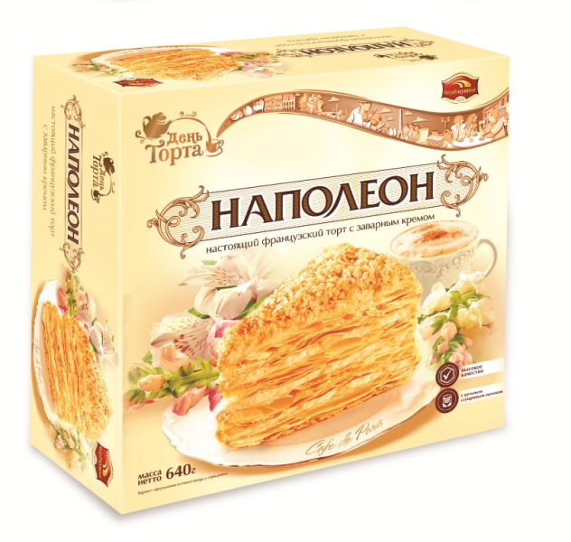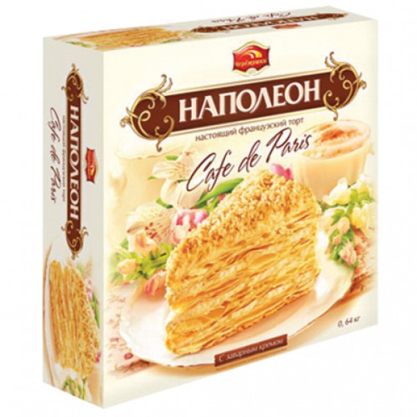 Торт Черемушки "Наполеон" слоеный с заварным кремом, 640г. Состав: мука пшеничная хлебопекарная в/с, молоко цельное сгущенное с сахаром (молоко цельное, сахар (сахароза, лактоза), жир кондитерский (растительные масла, в том числе соевое, эмульгатор эфиры полиглицерина и жирных кислот, антиокислитель токоферолы концентрат смеси), вода, маргарин (растительные масла, вода, эмульгаторы: лецитин соевый, Е471, соль, консерванты: сорбат калия, сорбиновая кислота, регулятор кислотности лимонная кислота, антиокислители: Е306, Е304, ароматизатор, краситель каротины), желток яичный сухой, соль, спирт этиловый ректификованный, консервант сорбат калия, ароматизаторы. Энергетическая ценность: 560 ккал. Пищевая ценность в 100г: белки 6,5г, жиры 42,0г, углеводы 38,5г. Условия хранения: при температуре от +2`C до +25`C и относительной влажности воздуха не более 85% без попадания прямых солнечных лучей. Срок годности 3 месяца.