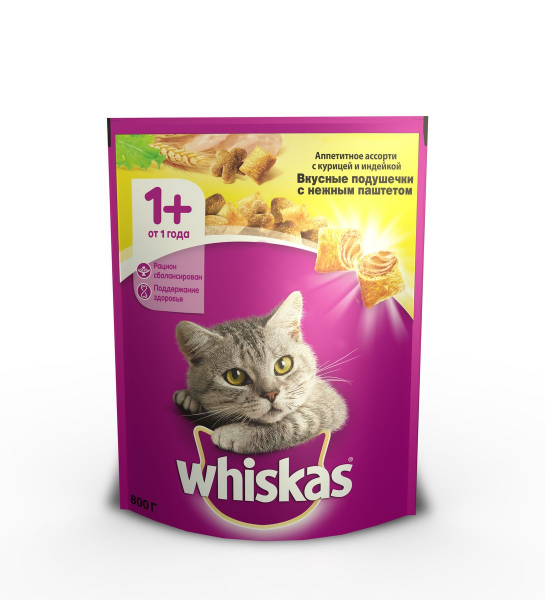 Сухой корм для кошек WHISKAS Вкусные подушечки с нежным паштетом, Аппетитное ассорти с курицей и индейкой - другой весовой вариант популярного корма для взрослого животного. В составе корма сбалансированы все необходимые питательные вещества для активной жизнедеятельности взрослого животного. Содержание: мука животного происхождения из птицы, утки, индейки, растительные белковые экстракты, сухая куриная и свиная печень, пивные дрожжи. Содержанию витаминов и жирных кислот избавляет вашего питомца от проблем и пищеварением, шерсть делает красивой и здоровой. Корм WHISKAS поддерживает здоровье мочевыводящей системы, благодаря ему ваш любимец будет всегда здоров и весел. Приобрести Сухой корм для кошек WHISKAS Вкусные подушечки с нежным паштетом, Аппетитное ассорти с курицей и индейкой, 800 гр. можно в Москве в торговом центре METRO.Вес в упаковке: 800 г.Срок хранения: 365 дней.Страна-изготовитель: Россия.