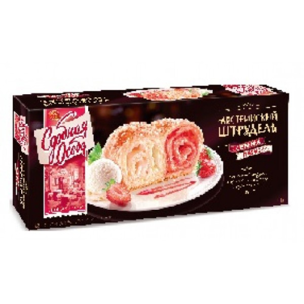 В тонких слоях штруделя сочетаются две начинки: клубничная и со вкусом пломбира. Оригинальная закрутка штруделя сохраняет его нежным и мягким до конца срока годности.