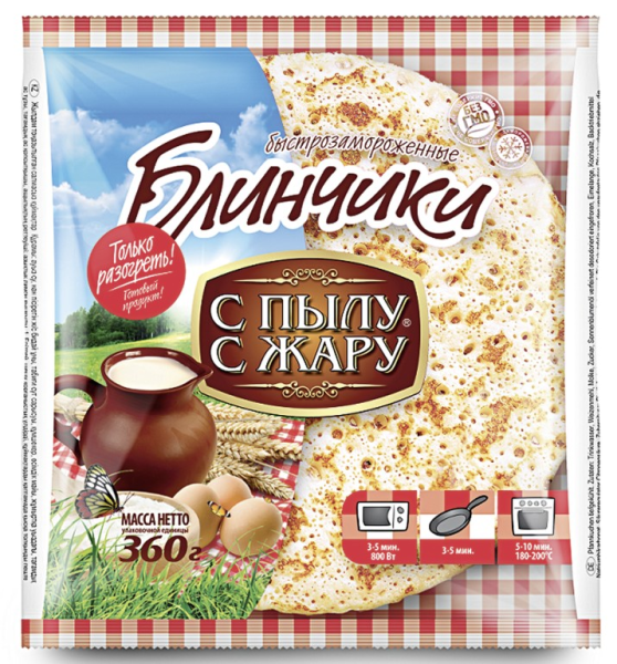 Блинчики С ПЫЛУ С ЖАРУ без начинки быстрозамороженные, 360 г – вкусный и удобный для приготовления продукт, который полностью готов к употреблению. Блинчики не нужно поджаривать, достаточно просто разогреть их в микроволновой печи. Подать на стол их можно как со сливочным маслом или сметаной, так и с джемами, вареньем, мороженым. Продукт приготовлен из натуральных компонентов на основе пшеничной муки высшего качества и подвергнут быстрой заморозке для сохранения вкусовых качеств. Купить блинчики С ПЫЛУ С ЖАРУ без начинки быстрозамороженные, 360 г вы можете в Москве в торговом центре METRO.