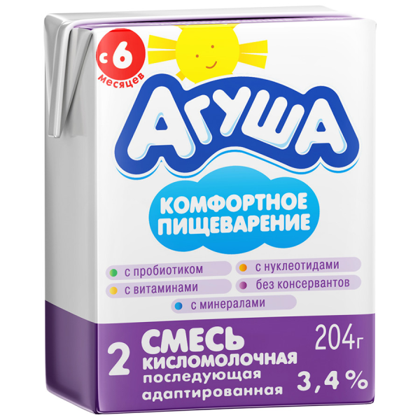 Описание и характеристики Состав: молоко цельное, лактоза, фруктоза, смесь растительных масел (соевое масло, рапсовое масло, высокоолеиновое подсолнечное масло, пальмовый олеин, кокосовое масло, кукурузное масло), мальтодекстрин, концентрат белка молочной сыворотки, минеральный премикс, витаминный премикс, бифидоацидофильная закваска, нуклеотиды. Способ употребления: перед кормлением детей содержимое пакета перелить в бутылочку и подогреть до +36'C. Пищевая ценность на 100г: белки - 1,8г, жиры - 3,4г, углеводы - 9,0г. Энергетическая ценность: 74 ккал. Хранить при температуре от +2'C до +6'C и относительной влажности не более 75%. Проконсультируйтесь со специалистом. Срок годности 14 дней. Продукт во вскрытой упаковке хранению не подлежит. ТУ 9229-119-05268977-14