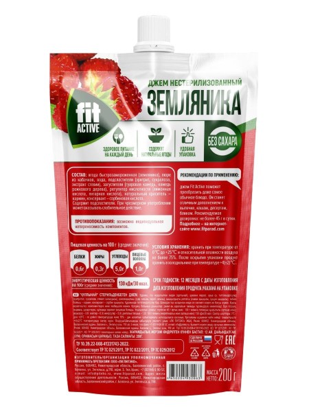 Джем Фит Актив Земляника без сахара 200гр дой-пак