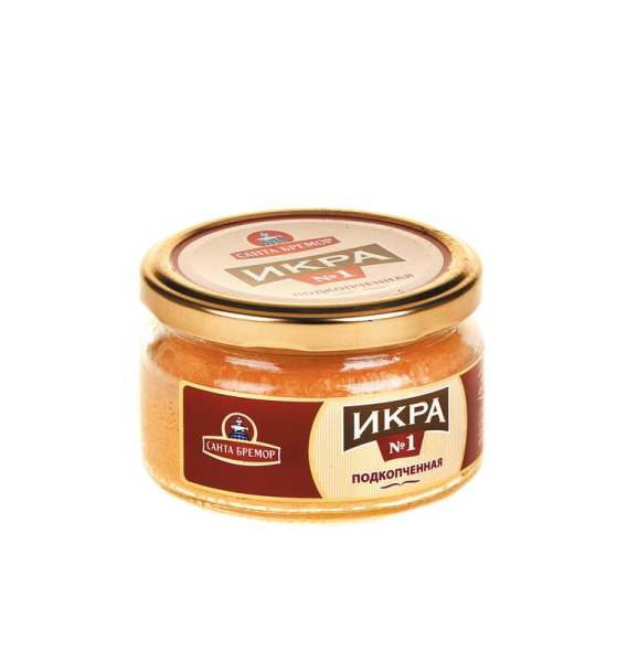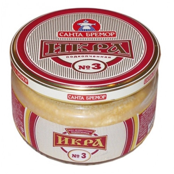 Икра деликатесная САНТА БРЕМОР подкопченая, 180г – это деликатесная закуска, которая стает прекрасным дополнением к любому столу. При изготовлении используется натуральная икра мойвы. Ее оригинальный вкус сделал ее желанным продуктом к каждому празднику, а также повседневному ужину. Изготавливается при помощи специальных технологий, что позволяет сохранить натуральный вкус. Икра обладает нежной, приятной консистенцией и изысканным слабосоленым вкусом. Прекрасно подойдет в качестве дополнения для бутербродов из ржаного и пшеничного хлеба. Приобрести икру мойвы можно в Москве в METRO.Состав: Крем сырный (полуфабрикат творожный, масло кокосовое, масло сливочное, молоко сухое обезжиренное, пищевые добавки (молочный белок, соли- плавители Е451, Е452, Е339, загустители модифицированный крахмал, ксантановая камедь) ,ароматизатор натуральный Чеддар, соль), икра подкопченная деликатесная (икра мойвы соленая, масло растительное, икра мойвы копченая, сахар, пищевая добавка (сухой яичный желток, загустители Е401, Е412), регуляторы кислотности (Е270, Е296, Е260, Е330), краситель пищевой натуральный масляный экстракт перца, вода).Условия хранения: при температуре от -2 до +4 С.Энергетический состав: белки: 10,40 г, жиры: 26,80 г.Срок годности: 6 месяцев.