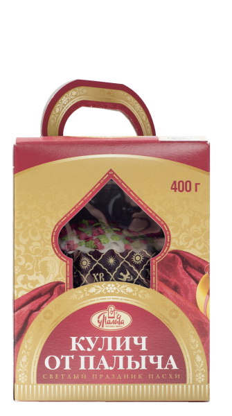 Кулич ОТ ПАЛЫЧА, 400 г создан по классическому рецепту в лучших пасхальных традициях с добавлением ароматного ванилина и изюма. Мягкий и свежий кулич станет настоящим украшением праздничного стола и отличным угощением к чаю для ваших родных и гостей. Выпечка изготовлена из муки высшего сорта на основе натуральных куриных яиц и не содержит вредных красителей, ГМО и консервантов. Декоративная посыпка кулича придает ему особенно аппетитный и праздничный внешний вид. Продукт поставляется в красочной подарочной упаковке. Купить кулич ОТ ПАЛЫЧА, 400 г вы можете в Москве в торговом центре METRO.Производитель: ООО Компания у Палыча, Россия.Состав: сахар-песок, яйцо куриное, смесь для бисквита (пшеничная мука, пшеничный крахмал, йогуртовый порошок, модифицированный крахмал, соль, сухая сыворотка, ароматизаторы), масло растительное рафинированное дезодорированное, изюм, помадка сахарная, мука пшеничная в/с, декоративная посыпка.Пищевая ценность: белки – 4,9 г, жиры – 20,3 г, углеводы – 59,3 г.Энергетическая ценность: 439,3 ккал.Срок годности: 10 суток.ГОСТ ТУ 9136-001-76410657-08.