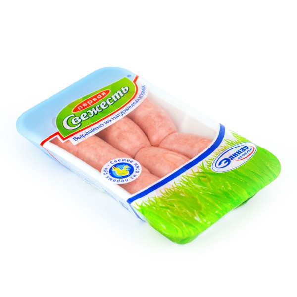 Кожа куриная, фарш куриный, филе грудки, вода, натуральная оболочка (черева свиная), соль, специи.