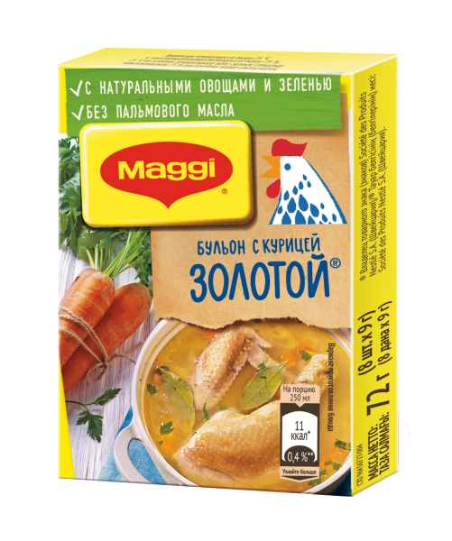 Магги® Золотой® Бульонные кубики. Бульон с курицей, брикетированный 72 г. Больше никаких сомнений! Ваш любимый помощник -обновленный MAGGI ЗОЛОТОЙ Бульон с курицей теперь содержит только знакомые ингредиенты: натуральные овощи, зелень и НИКАКОГО ПАЛЬМОВОГО МАСЛА!В каждом бульонном кубике идеально сбалансированы куриный и овощной вкусы, соль и тщательно подобранный букет пряностей и специй.Благодаря кубику ваши блюда приобретают вкус и аромат настоящего домашнего куриного бульона, а также аппетитный золотистый цвет.Вы можете купить Магги® Золотой® Бульонные кубики. Бульон с курицей, брикетированный 72 г в торговом центре METRO.Тип: кулинария.Состав: Йодированная соль (соль, йодат калия), крахмал кукурузный, сахар, cухой сироп глюкозы, говяжий жир топленый, кукурузный соус (крахмал кукурузный,соль), куриный жир топленый (2 %), вода, ароматизаторы (курица), овощи и зелень сушеная (0,9 %) (сельдерей, петрушка, морковь (0,1 %), чеснок, лук репчатый),специи молотые (куркума, перец черный, карри, лавровый лист), регулятор кислотности (лимонная кислота), ароматизаторы (укроп, свежие травы).Продукт может содержать глютен (из пшеницы), молоко.Бренд: MAGGI.Вес нетто: 0.072 кг.Условия хранения: до 25 C°.Срок годности: 360 дней.
