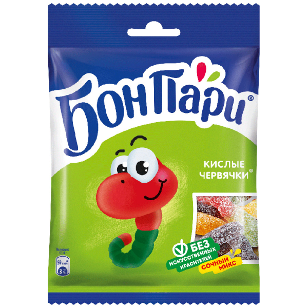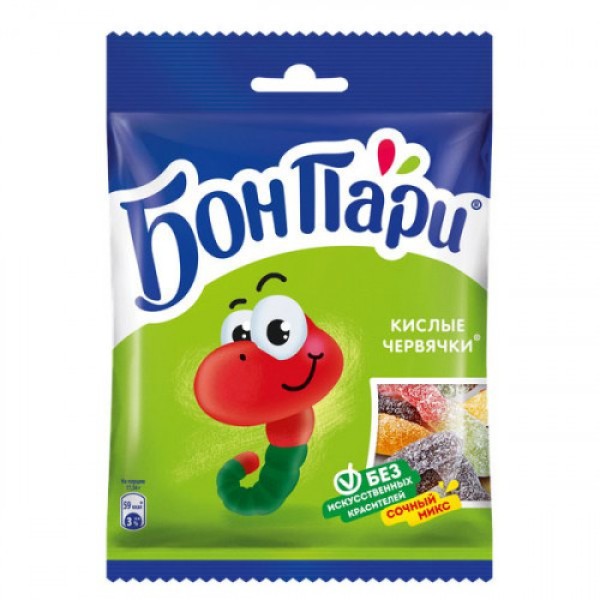 Описание и характеристики ООО "Нестле Россия". Бон Пари мармелад жевательный кислые червячки. Состав: патока, сахар, крахмал кукурузный модифицированный окисленный, желатин, вода, регуляторы кислотности (яблочная, винная и молочная кислоты, лактат кальция, лимонная кислота), концентрированный яблочный сок, натуральные красители (антоцианы (получен из моркови), уголь растительный, куркумин, медные комплексы хлорофиллинов (получен из шелковицы)), натуральные ароматизаторы (черная смородина, яблоко, с маслом лимона, малина), витамин С. Продукт может содержать орехи, глютен, молоко и диоксид серы. Пищевая и энергетическая ценность: белки - 3,6г, углеводы - 80г, 341 ккал. Хранить: в сухом и прохладном месте. Срок хранения: 10 месяцев. СТО 96436727-003
