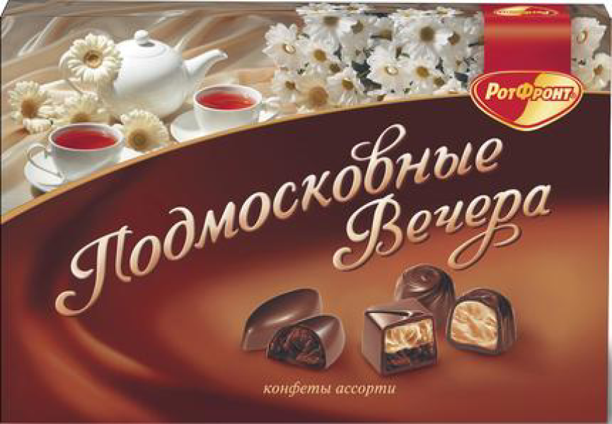Шоколадные конфеты ПОДМОСКОВНЫЕ ВЕЧЕРА, 200г выпускаются на фабрике «Красный Октябрь». Десерт, знакомый всем с детства, включает в себя ассорти из трех видов начинки: сливочной, кремово-ореховой, шоколадной помадки.Каждый вкус имеет свою форму: круглую, квадратную и овальную. Верное соотношение ингредиентов обеспечивает качество продукта и позволяет шоколаду идеально обволакивать начинку. Благодаря этому лакомство имеет гладкую структуру и не крошится. Приобрести шоколадные конфеты ПОДМОСКОВНЫЕ ВЕЧЕРА, 200г можно в Москве в торговых центрах METRO по привлекательной цене.ОАО «Красный Октябрь» Россия, г. Москва, Малая Красносельская ул., д. 7,стр. 24.Конфеты Ассорти Подмосковные вечера 200г.Состав: кондитерская глазурь (сахар, заменитель масла какао, какао-порошок, арахис тёртый, эмульгаторы Е322 и Е476, ароматизатор идентичный натуральному «Баттерскотч»), сахар, сгущённое с сахаром молоко, жир кондитерский (растительный), ядро ореха миндаля тёртое, патока, сухое цельное молоко, заменитель молочного жира (растительный), спирт, эмульгатор Е322, ароматизаторы идентичные натуральным «Пломбир с лесным орехом», «Шоколад», «Карамель-крем».Противопоказано при индивидуальной непереносимости белка молока.В 100 г продукта содержится: белки - 4,3 г; жиры - 33,7 г; углеводы - 54,1 г.Энергетическая ценность: 532 ккал/100 г.Хранить при температуре от 15C до 21C и относительной влажности воздухане более 75%.Не подвергать воздействию прямого солнечного света.Срок годности: 9 месяцев.ТУ 9120-019-00340635.