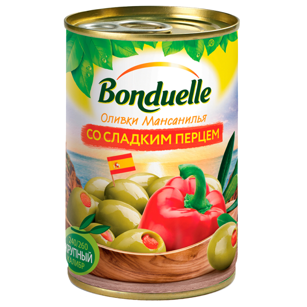 Оливки фаршированные сладким перцем БОНДЮЭЛЬ, 314 мл изготовлены в Испании и согреты жарким средиземноморским солнцем. Они хорошо подходят для подачи на стол в качестве самостоятельной закуски или для добавления в салаты, канапе, для украшения блюд. Сладкий перец гармонично оттеняет пикантный вкус крупных зеленых оливок, делает его более мягким. Жестяная банка легко открывается благодаря ключу на крышке. Вскрытую емкость производитель рекомендует хранить в холодильнике не более 7 суток. Приобрести оливки фаршированные сладким перцем БОНДЮЭЛЬ, 314 мл можно в Москве в торговом центре METRO. Состав: оливки зеленые сорта Мансанилья, вода питьевая, сладкий красный перец, натуральный ароматизатор, соль, усилитель вкуса и аромата Е621, стабилизатор Е401, регулятор кислотности (лимонная кислота и молочная кислота), антиокислитель аскорбиновая кислота.Пищевая ценность на 100 г продукта: белки – 2,17 г, жиры – 10,5 г, углеводы – 5,1 г.Энергетическая ценность: 166,67 ккал.Условия хранения: при температуре от 0 до +25 °С и относительной влажности воздуха не более 75%.Срок годности: 3 года.
