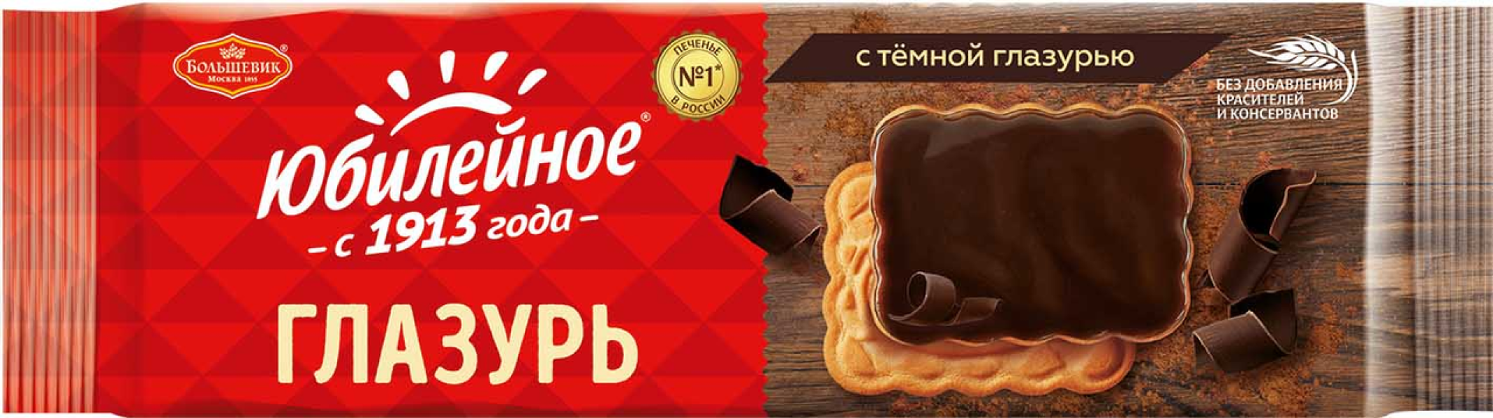 Печенье Юбилейное с темной глазурью, 116г. Без добавления консервантов и красителей. Состав: мука пшеничная, сахар, масло растительное, жир растительный, вода, какао-порошок, сироп глюкозно-фруктозный, разрыхлитель (гидрокарбонат натрия), соль, эмульгаторы (лецитин соевый, Е476, лецитин подсолнечный), продукт яичный, ароматизатор, витаминно-минеральный комплекс. Содержит: пшеницу, глютен, яйца, лецитин соевый. Может содержать следы молочных продуктов и орехов. Пищевая ценность в 100г продукта: белки - 6,8г, углеводы - 63,5г, жиры -23г. Энергетическая ценность: 485 ккал. Срок годности: 9 месяцев. Хранить в при температуре 18+-5`С и относительной влажности воздуха не более 75%. ТУ 9131-002-00340641
