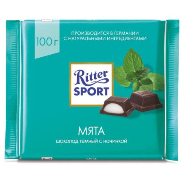 Шоколад темный с мятой RITTER SPORT, 100 г – это оригинальное сочетание вкусов, которое порадует гурманов всех возрастов. Шоколад дополнен мягкой начинкой с натуральным маслом мяты из США. Ансамбль сладости и освежающего вкуса поднимает настроение и будет хорошо сочетаться с чаем, кофе и другими горячими напитками. Шоколад отличается небольшим форматом, поэтому легко помещается даже в карман. Его удобно брать в качестве перекуса на учебу или работу. Упаковка Knick-Pack быстро раскрывается, когда вы разламываете плитку. Приобрести шоколад темный с мятой RITTER SPORT, 100 г можно в Москве в торговом центре METRO.Бренд: RITTER SPORT.Страна-изготовитель: Германия.Вкус: мята.Содержание какао: 50%.Пищевая ценность: белки — 4 г, углеводы — 58 г, жиры — 27 г, в том числе насыщенные жирные кислоты — 17,85 г, в том числе трансизомеры ненасыщенных жирных кислот — 0,06 г.Энергетическая ценность: 493 ккал. Условия хранения: при температуре от +15°С до +21°С, с относительной влажностью воздуха не более 65%.Состав: сахар, какао тертое, масло какао, молочный жир, эмульгатор (соевый лецитин). Начинка: Сахар, растительное масло — смесь (пальмовое, кокосовое), глюкозный сироп, влагоудерживающий агент (сорбитовый сироп), натуральный ароматизатор мяты (масло мяты полевой, ментол, масло мяты перечной), эмульгатор (соевый лецитин). Может содержать следы арахиса, орехов, глютена, молочных продуктов и яиц. Содержание в шоколадной массе: общего сухого остатка какао — не менее 50%.Срок годности: 12 месяцев.Вес: 100 г.