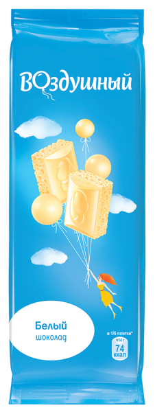 Шоколад белый ВОЗДУШНЫЙ пористый, 85 г – лакомство, которое одинаково понравится детям и взрослым. Благодаря пористой структуре он действительно воздушный и просто тает во рту, оставляя приятное послевкусие. Пузырьки лопаются, добавляя к вкусовым ощущениям необычные тактильные. Легкий привкус ванилина добавляет своеобразные нотки в основной вкус, делая этот шоколад особенным. В состав входит натуральное цельное молоко, молочные жиры и какао-масло, что делает лакомство не только вкусным, но и полезным. Его можно подать на десерт, заменить шоколадкой ланч на работе или использовать в кулинарных рецептах. Купить шоколад белый ВОЗДУШНЫЙ пористый, 85 г можно в Москве в торговом центре METRO.Бренд: ВОЗДУШНЫЙПроизводитель: Мон'Дэлис Русь ООО.Страна: Россия.Условия хранения: при температуре +18(±3)°C и относительной влажности воздуха не более 75%.Срок хранения: 9 мес.Шоколадное изделие: плитка.Вид шоколада: белый.Добавки: молоко.Сорт: пористый.Содержание какао: до 35%.Формат: порционный.Упаковка: флоу-пак.Пищевая ценность на 100 г: белки 4,4 г, жиры 27,0 г, углеводы 65,0 г.Калорийность: 525 ккал.Состав: сахар, масло какао, сыворотка сухая молочная, молоко сухое цельное, жир молочный, эмульгаторы (лецитин соевый, Е476), ароматизатор. Содержит молочные продукты, лецитин соевый.