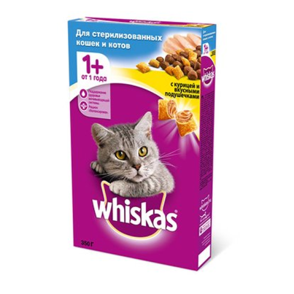 Сухой корм для стерилизованных кошек Whiskas с курицей и вкусными подушечками разработан с таким учётом, чтобы удовлетворить все потребности животного в белках, витаминах и микроэлементах. Специально подобранные ингредиенты корма легко усваиваются организмом кошки и позволяют поддерживать здоровый обмен веществ, а так же направлены на предотвращение мочекаменной болезни. А благодаря сухой текстуре корма с зубов вашей любимицы будет удаляться лишний налёт. Корм содержит витамины А и Е, необходимые для поддержания иммунитета и хорошего зрения , кальций и фосфор для опорно-двигательного аппарата и цинк для блестящей шёрстки. Купить сухой корм для стерилизованных кошек Whiskas с курицей и вкусными подушечками, 350 г вы можете в Москве в торговом центре METRO.Бренд: WhiskasСтрана производства: РоссияОбъем: 350 гр
