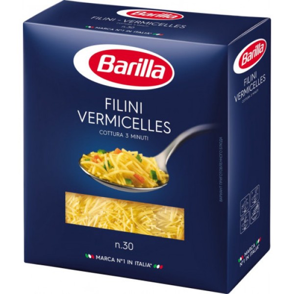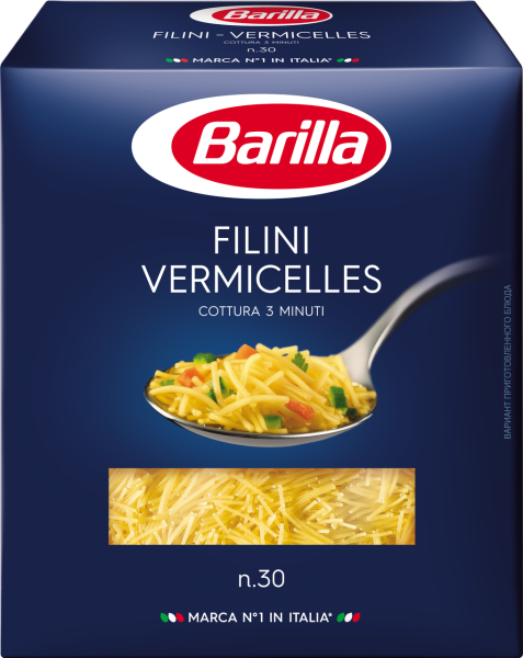 BARILLA Филини – итальянская паста, которая порадует своим легким вкусом. Она имеет форму тонких и коротких нитей и подходит для супов. Ниточки теста готовятся из высококачественной пшеничной муки и чистой воды. Благодаря небольшому размеру макароны быстро готовятся (всего 3 минуты) и не слипаются.BARILLA Филини с низким гликемическим индексом богаты железом и витаминами группы В. Эти вещества являются источником энергии и благотворно влияют на работу систем и органов. Макароны поставляются в традиционной для бренда картонной коробке синего цвета. Хранить их следует в сухом месте, где температура не превышает 30 градусов, а влажность воздуха составляет не более 75%.Купить макароны BARILLA Филини, 450 г можно в Москве в торговом центре METRO.Тип: макароны.Форма макаронных изделий: вермишель.Размер макаронных изделий: короткие.Белки, г/100 г: 14.Жиры, г/100 г: 2.Энергетическая ценность, ккал/100 г: 359.Состав: мука, вода.Не содержит: ГМО.Особенности: из твердых сортов пшеницы, постный продукт.Страна-изготовитель: Россия.Упаковка: картонная коробка.Срок годности в днях: 960.Бренд: Barilla.Серии: короткая паста.Артикул: 8076808050303.
