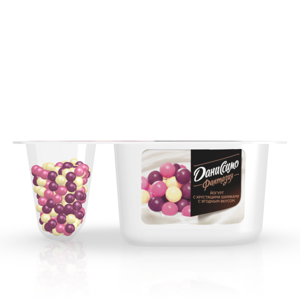 Легкий воздушный йогурт ДАНИССИМО Фантазия Хрустящие шарики с ягодным вкусом 6,9% жирности подарит сочный и нежный вкус. Продукт приготовлен из свежего натурального творога и сливок, что делает его бархатистым и таящим во рту, очень нежным и незабываемым. Содержащиеся кусочки фруктов и шоколада придают каждой ложке насыщенный, богатый вкус. Йогурт ДАНИССИМО Фантазия Хрустящие шарики с ягодным вкусом 6,9%, 105г  всегда можно найти по приемлемой цене  в Москве в ассортименте торгового центра METRO.Состав: белый шоколад ((сахар, какао-масло, сухое цельное молоко, сухая молочная сыворотка, эмульгатор - соевый лецитин, натуральный ароматизатор ванили): злаковая сердцевинка (рис, пшеничная мука, сахар, мука из ячменного солода, соль), красители - красный свекольный, кармины, загуститель – гуммиарабик, глазирователь - шеллак, регулятор кислотности – лимонная кислота, ароматизаторы.Пищевая ценность в 100г: белки – 4,8 г, жиры – 24,7 г, углеводы – 66,8 г.Энергетическая ценность: 509 ккал.Масса нетто: 105 г.Срок годности: 40 дней.Условия хранения: хранить при температуре от -2°С до +4°С.Тип упаковки: пластиковая бутылка.Производитель: ООО «Данон Индустрия».