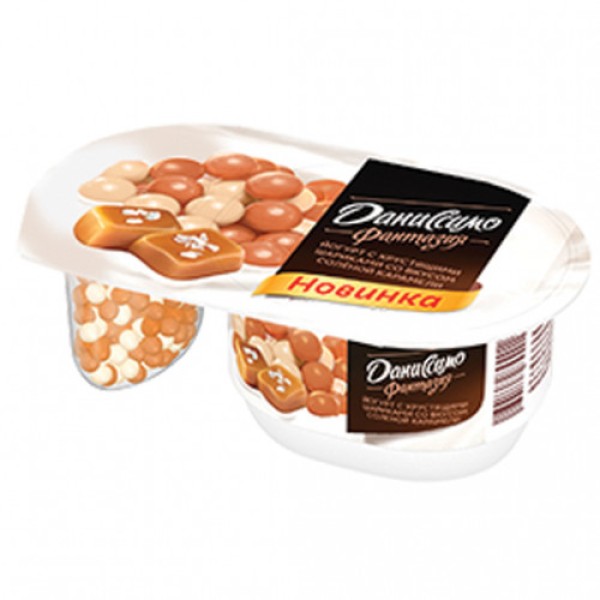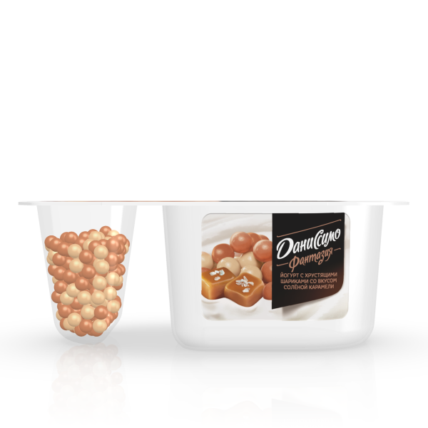 Десерт творожный Фантазия Хрустящие шарики в карамели ДАНИССИМО, 105 г – изысканное лакомство, которое понравится и взрослым, и малышам. В его состав входит нежный и легкий кисломолочный продукт, пикантность которому придают хрустящие воздушные шарики с оригинальным вкусом соленой карамели. Десерт изготовлен на основе натурального молока и йогуртовой закваски – он не только вкусен, но и приносит большую пользу организму. Употребление кисломолочных продуктов благотворно сказывается на работе органов пищеварения, повышает иммунитет, улучшает состояние кожи и волос. Продукт можно есть на завтрак или полдник, использовать в качестве полезного перекуса в течение дня. Десерт помещен в герметичную пластиковую упаковку объемом 105 грамм. Чтобы сохранить хрустящую структуру топпинга, его поместили в отдельном стаканчике. Для максимального раскрытия вкусовых качеств рекомендуется смешивать карамельные шарики с творожным продуктом непосредственно перед употреблением.Приобрести десерт творожный Фантазия Хрустящие шарики в карамели ДАНИССИМО, 105 г можно в Москве в торговом центре METRO.Тип: йогурт.Сырье: коровье.Жирность: 6,9%.Добавки: соленая карамель.Особенности: не содержит заменителей молочного жира. Органический продукт.Энергетическая ценность: 123 ккал.Пищевая ценность: белки 3,3 г, жиры 6,9 г, углеводы 11,9 г.Состав: Йогурт: нормализованное молоко, восстановленное молоко из сухого молока, сахар, йогуртовая закваска. Смесь злаковых шариков в молочной шоколадной глазури со вкусом соленой карамели и злаковых шариков в белом шоколаде: сахар, какао-масло, рисовая мука, сухое цельное молоко, карамельный порошок (сгущенное молого, сахар, глюкозный сироп, соль, регулятор кислотности — Е500), пшеничная мука, сухая молочная сыворотка, соль, пшеничные отруби, какао-масса, солодовый ячмень, эмульгатор — соевый лецитин, натуральный ароматизатор).Упаковка: пластиковая емкость.Размеры упаковки: 126х73х44 мм.Условия хранения: хранить в холодильнике при температуре от +2°С до +6°С. Вскрытую упаковку не хранить.Срок годности: 40 суток.Вес: 105 г.Бренд: Даниссимо.Производитель: АО «Данон Россия»Страна-производитель: Россия.