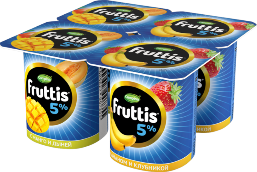 Йогурт FRUTTIS манго-дыня/банан-клубника 5%, 4х115г – это пастеризованный продукт, который обладает невероятно нежной консистенцией и содержит сочные кусочки фруктов. FRUTTIS имеет тонкий аромат и приятный светло-кремовый цвет. Благодаря сбалансированному составу, продукт не очень сладкий, характеризуется сливочно-фруктовым вкусом. Легкий и в то же время питательный йогурт содержит всего 83 ккал на 100 г, что делает его подходящим для диетического рациона. Йогурт FRUTTIS манго-дыня/банан-клубника 5%, 4х115гвсегда можно найти в Москве в ассортименте торгового центра METRO.Состав: обезжиренное молоко, сливки, фруктовый наполнитель (банан, дыня, сахар, вода, загуститель – модифицированный крахмал, ароматизатор идентичный натуральному, красители: антоциан и кармин, регулятор кислотность: бета-каротин, регуляторы кислотности) вода, сахар, глюкозно-фруктозный сироп, загуститель - модифицированный крахмал, сухая молочная сыворотка, загуститель - пищевой желатин, с использованием закваски.Пищевая ценность в 100г: белки — 2,7 г, жиры — 0, 1 г, углеводы – 17,4 г.Калорийность: 83 ккал.Масса нетто: 4*110 г.Срок годности: 150 суток.Условия хранения: хранить при температуре от +2C до +25C.Рекомендовано хранить в холодильнике.Тип упаковки: пластиковый стаканчик.Производитель: ООО «Кампина».Страна-производитель: Россия.