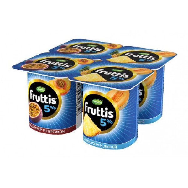 Продукт йогуртный Fruttis Персик-маракуйя Ананас-дыня 5% 115 г создан на основе отборного молока, сливок и сочных фруктов. Он станет хорошим вариантом десерта или быстрого перекуса. Продукт не содержит искусственных красителей, хорошо утоляет голод, не перегружая желудок. Он обладает густой консистенцией, приятным вкусом и ароматом. Продукт продается блоками. Каждый из них включает два йогурта «Персик-маракуйя» и два – с ананасово-дынным вкусом. Упаковка надежно сохраняет вкусовые качества продукта в пределах установленного срока годности. Компактные пластиковые стаканчики с герметичными металлизированными крышками удобны в хранении. Они легко поместятся на полке в холодильнике. Такой формат удобно брать с собой – для него найдется место в любой сумочке. Приобрести продукт йогуртный Fruttis Персик-маракуйя Ананас-дыня 5% 115 г можно в Москве в торговом центре METRO.Страна-производитель: Россия.Бренд: FRUTTIS.Состав: Ананас-Дыня — молоко нормализованное, вода, наполнитель (ананас, сахар, вода, дыня, загуститель — дикрахмалфосфат оксипропилированный, ароматизаторы, регулятор кислотности — лимонная кислота, красители: каротины, экстракт паприки), сахар, глюкозно-фруктозный сироп, загуститель – дикрахмаладипат ацетилированный, сыворотка сухая молочная, пищевой желатин, лактоза, с использованием закваски. /Персик-маракуйя — молоко нормализованное, вода, наполнитель (персик, сахар, вода, маракуйя, загуститель – дикрахмалфосфат оксипропилированный, ароматизаторы, красители; каротины, экстракт паприки; регулятор кислотности — цитраты натрия), сахар, глюкозно-фруктозный сироп, загуститель – дикрахмаладипат ацетилированный, сыворотка сухая молочная, пищевой желатин, лактоза, с использованием закваски.Пищевая ценность на 100 г продукта: белки – 2,2 г, жиры – 5 г, углеводы – 16 г. Энергетическая ценность: 120 ккал.Хранить при температуре от 2°С до 12°С. Срок годности: 150 дней.