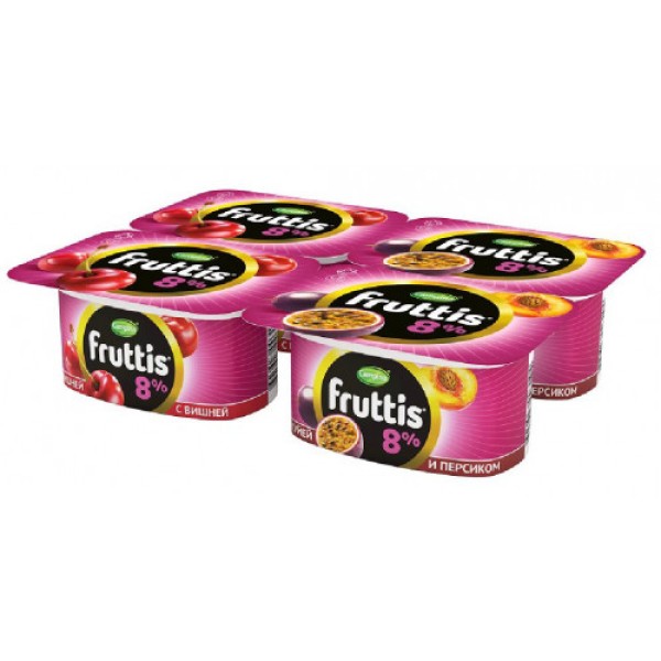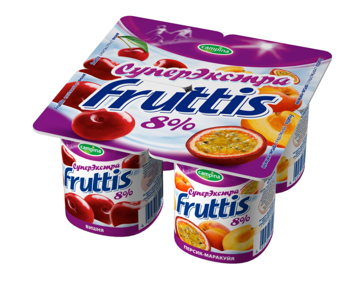 Йогуртовый продукт FRUTTIS Вишня/ персик-маракуйя – это популярный десерт, который любят за нежный фруктовый вкус и дети, и взрослые. Продукт изготовлен из натуральных сливок и обезжиренного молока и имеет легкую однородную структуру, благодаря которой он просто тает во рту. Изделие крупного известного производителя отличается высоким качеством, свойственным всей линейке производимых товаров. Компактная упаковка позволяет брать йогурт с собой в поездки, а также давать детям в школу или на прогулку. Продукт прекрасно подойдет для легкого перекуса в любое время дня и подарит хорошее настроение и приятное послевкусие. Вы можете купить йогуртовый продукт FRUTTIS Вишня/ персик - маракуйя 8%, 4*115 г в Москве в торговом центре METRO.Продукт йогуртный пастеризованный «Суперэкстра».Массовая доля жира 8,0%.Состав: обезжиренное молоко, сливки, фруктовый наполнитель (персик, сахар, вода, маракуйя, загуститель - модиф. крахмал, ароматизаторы «Персик», «маракуйя» идентичные натуральным, регулятор кислотности - цитрат натрия, красители: бета-каротин, маслосмолы паприки), вода, сахар, глюкозно-фруктозный сироп, загуститель - модиф. крахмал, молочный жир, сухая молочная сыворотка, загуститель - пищевой желатин, с использованием закваски. Изготовлено с использованием сухой молочной сыворотки.Хранить при температуре от +2 до +25 градусов.Годен до (число, месяц, год): см. на крышке.ТУ 9222-003-18255315.Изготовитель: ООО «Кампина», Россия.